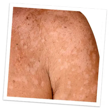 - Dotknięte obszary skóry są znacznie jaśniejsze niż otaczająca je zdrowa skóra lub nawet pozbawione są pigmentacji (łupież pstry)